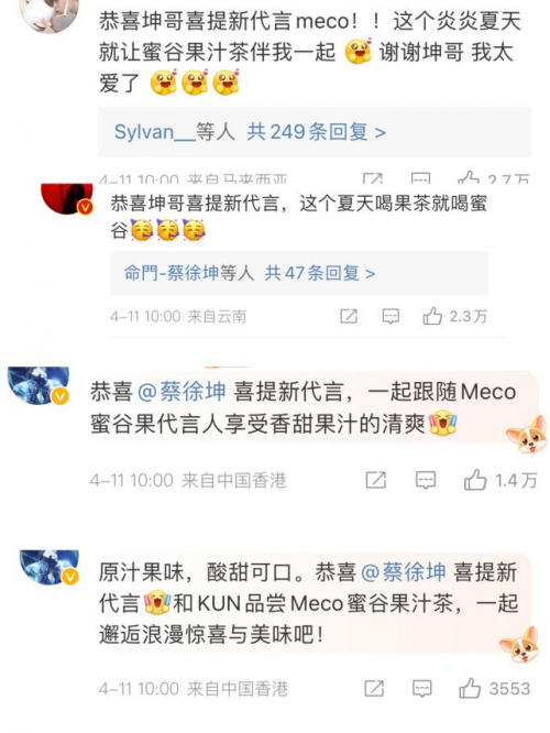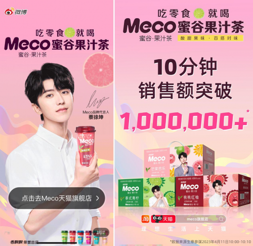 4月11日,Meco蜜谷官宣蔡徐坤為全新品牌代言人,并釋出雙方共同演繹的全新品牌質(zhì)感大片,“酸甜果味,百搭對味”的Meco蜜谷果汁茶立刻引發(fā)全網(wǎng)跟風(fēng)。