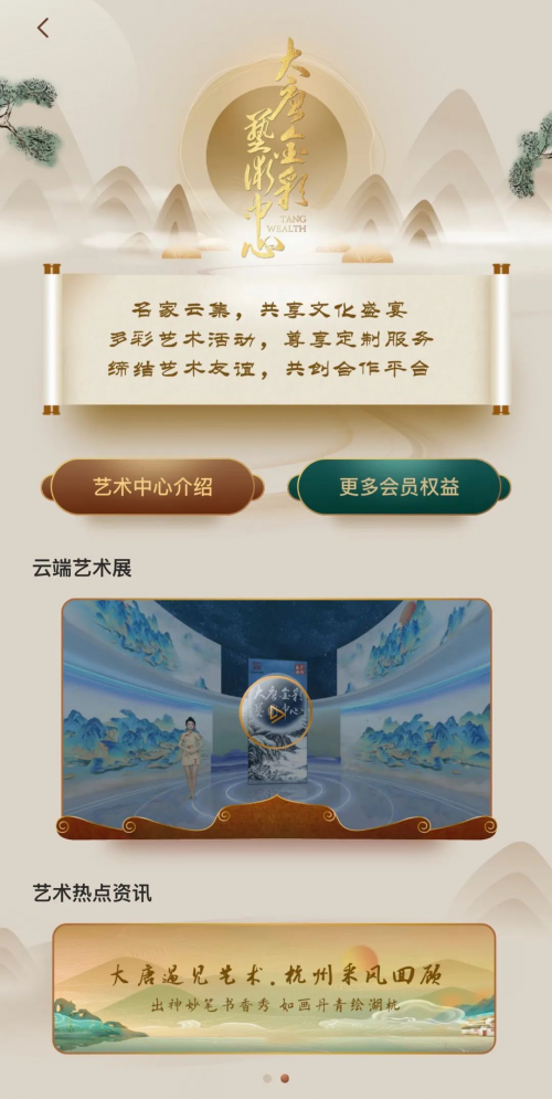 2023年,大唐財(cái)富提出“財(cái)富管理、健康管理與藝術(shù)文化”三大服務(wù)新生態(tài)?;诖?,唐人街搭建的六大板塊,全面覆蓋了健康、運(yùn)動、藝術(shù)文化、商旅出行、美容護(hù)膚、美食、酒店、消費(fèi)等服務(wù)場景,實(shí)現(xiàn)多場景服務(wù)的全面線上化、生態(tài)化,讓客戶享受金融服務(wù)之余,能夠更加直觀的感受美好生活服務(wù)。