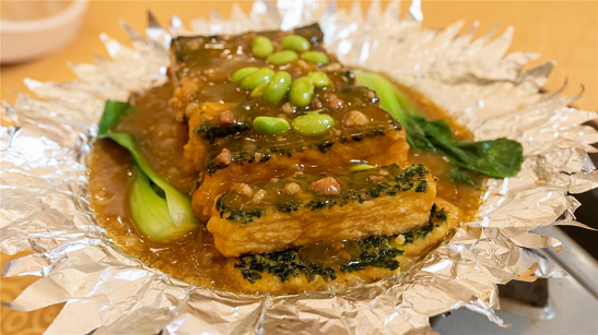 鐵板自制養(yǎng)生豆腐,里面有黃豆、雞蛋、菠菜、肉沫、老湯,將豆腐的鮮美發(fā)揮到極致,口口都是享受。