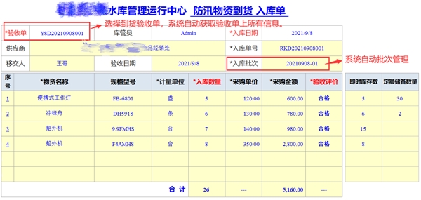 采購的防汛物資到貨驗收合格后移交倉庫管理員辦理入庫,在系統(tǒng)中登記物資到貨入庫單。