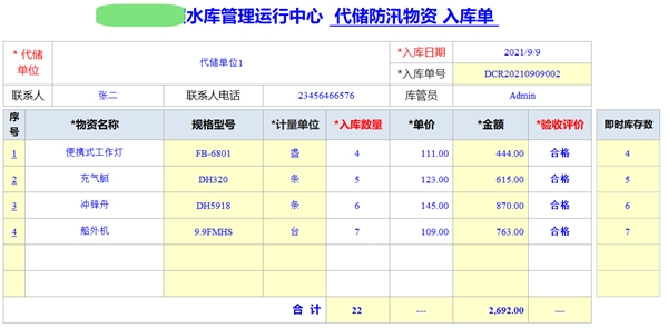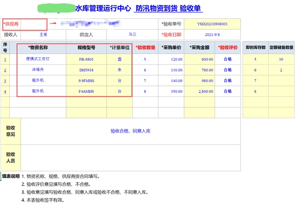 供應(yīng)商和防汛物資,都是列表選擇填報,保證基礎(chǔ)資料信息一致。系統(tǒng)自動獲取該物資當(dāng)前即時庫存數(shù)據(jù)。到貨驗收單可以打印出來,相關(guān)人員簽字存檔。