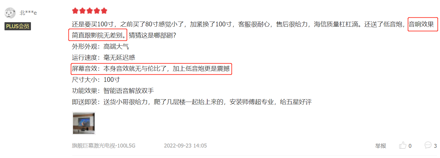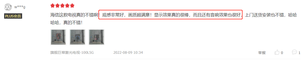 同時(shí),該產(chǎn)品機(jī)體以科技感外殼搭配混織網(wǎng)罩,典雅大氣,與高格調(diào)現(xiàn)代客廳完美融為一體。用戶(hù)對(duì)100L5G的高顏值贊不絕口,“美觀好看”“大氣”“高級(jí)”成為高頻詞匯。