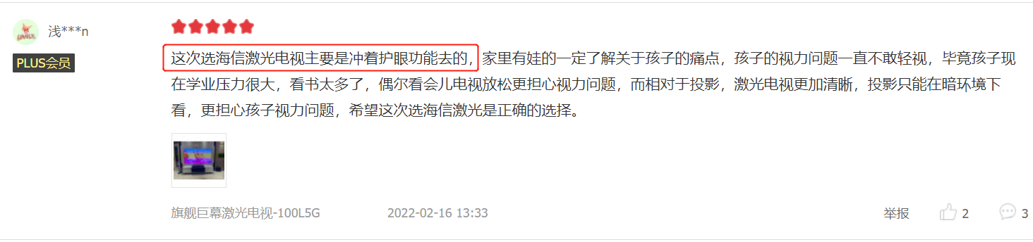 逐年升高的青少年近視發(fā)生率,讓家長(zhǎng)在挑選電視時(shí)極為看重產(chǎn)品的護(hù)眼能力。作為一款以用戶(hù)為中心研產(chǎn)的產(chǎn)品,100L5G有著源頭性的視力保護(hù)設(shè)計(jì)。其采用海信激光電視四大自研護(hù)眼科技,畫(huà)面由主機(jī)發(fā)射光線(xiàn),經(jīng)屏幕反射進(jìn)入人眼,反射成像更符合人眼生理結(jié)構(gòu),人眼久看不累。此外,100L5G完全避開(kāi)對(duì)人眼有害的405nm-445nm短波藍(lán)光,做到低藍(lán)光傷害,在觀看中不刺眼、不傷眼、不疲勞。用戶(hù)紛紛反饋,100L5G“給孩子看更放心”。