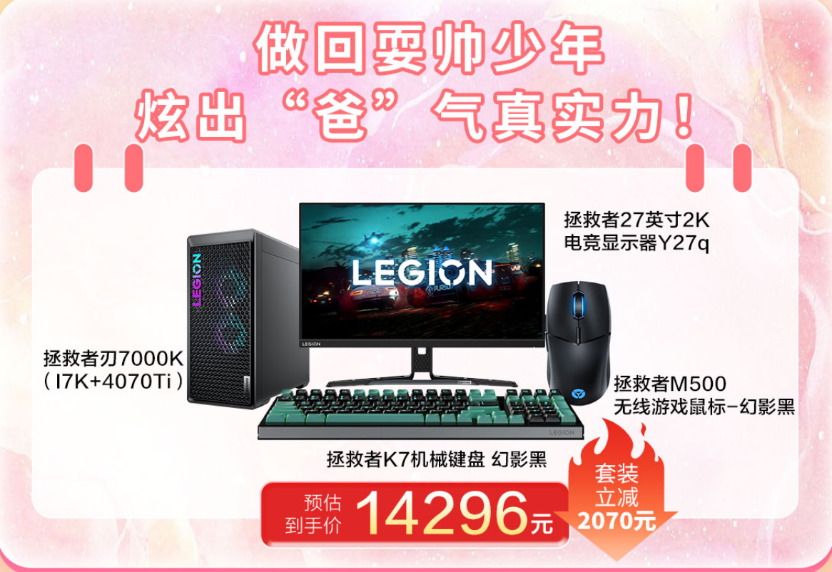 首先是拯救者系列超值游戲套裝,是父親節(jié)送禮首選。套裝包括性能王者拯救者刃7000K、超靈敏、手感超好的拯救者M(jìn)500無(wú)線游戲鼠標(biāo)、拯救者K7機(jī)械鍵盤,以及拯救者27英寸2K電競(jìng)顯示器Y27q四件組合直降2070元,到手僅需14296元。