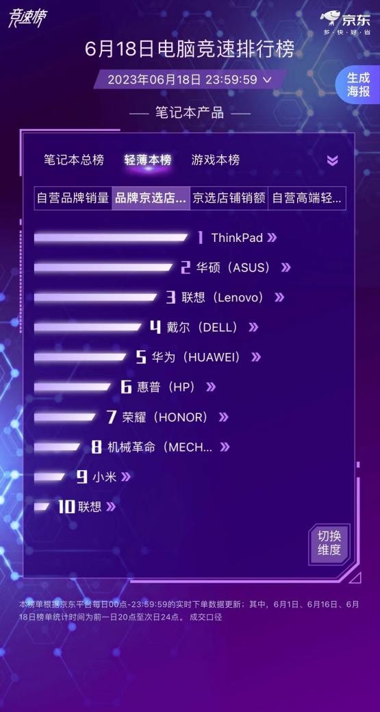 京東競速榜顯示,聯(lián)想筆記本斬獲筆記本自營品牌銷量與筆記本品牌京選店鋪銷售額冠軍,聯(lián)想輕薄本斬獲輕薄本自營品牌銷量冠軍,ThinkPad斬獲輕薄本品牌京選店鋪銷售額冠軍,ThinkPad高性能斬獲輕薄本自營高端輕薄本銷售額冠軍。