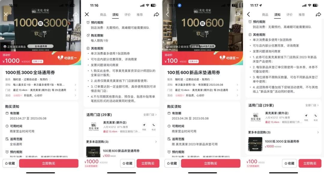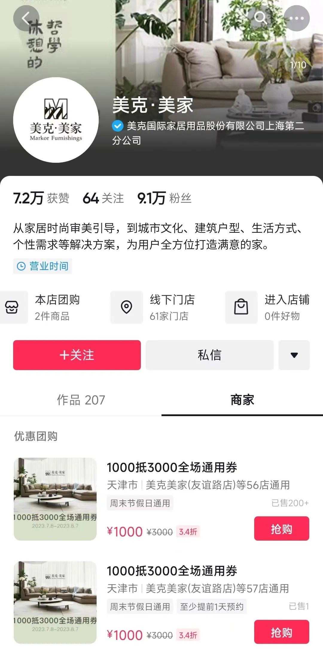 作為一個定 位高端的家居品牌,美克美家對自己的客戶人群有清晰的認知,在直播選品上不以數(shù)量為標準,而是聚焦核心顧客,通過高額意向金篩選顧客意向,以「專屬、爆品」策略為核心,借勢“美克美家品牌軟裝節(jié)”活動,打造抖音本地團購直播間專屬優(yōu)惠福利,并且與線下門店優(yōu)惠活動同享。以線上“云逛店”實景直播互動充分了解客戶需求,進而邀請客戶進入線下門店場景體驗一站式服務,實現(xiàn)從需求引導到交易完成的閉環(huán)。