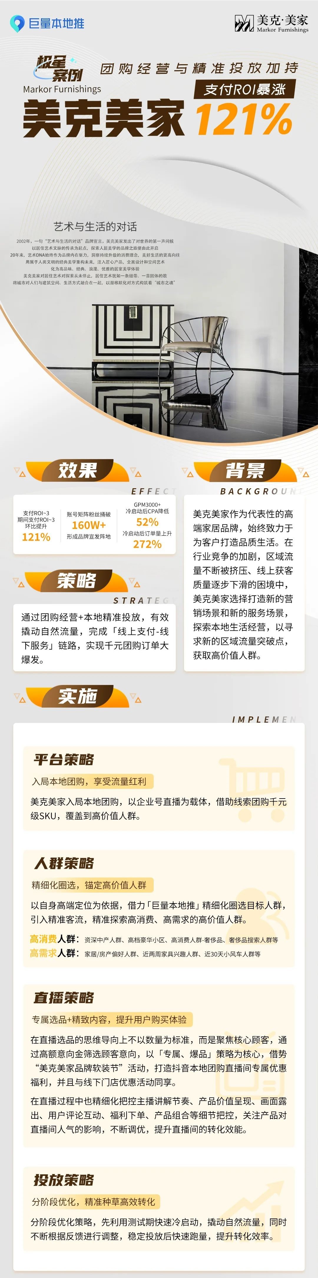 美克美家作為代表性的高端家居品牌,始終致力于為客戶打造品質生活。在行業(yè)競爭的加劇,區(qū)域流量不斷被擠壓、線上獲客質量逐步下滑的困境中,美克美家選擇打造新的營銷場景和新的服務場景,探索本地生活經營。在本地團購中,美克美家借力「巨量本地推」引入精準客流,有效撬動自然流量,完成線上支付-線下服務鏈路,最終實現(xiàn)干元團購訂單持續(xù)上漲,支付ROI提升121%,交出了一份滿意的答卷。