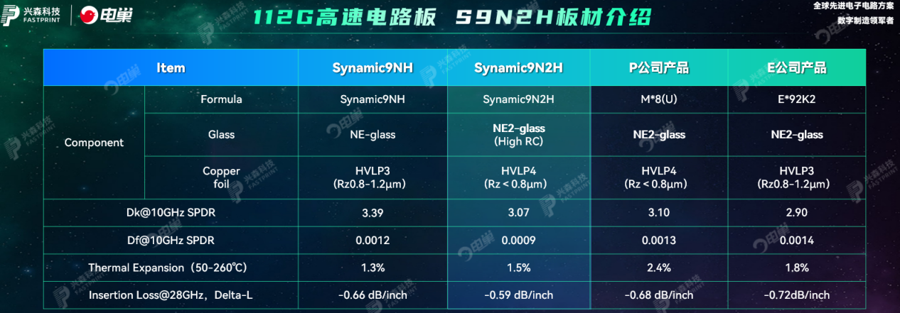 以生益科技S9NH板材為例,這是一款超低損耗高多層高可靠性電路板基材,其相對(duì)于行業(yè)內(nèi)的同級(jí)別產(chǎn)品,具有更低的熱膨脹系數(shù)和更好的介電性能。S9NH采用NE-glass做增強(qiáng)材料時(shí),可達(dá)到P公司產(chǎn)品使用NE2-glass的插損水平,NE2-glass目前在行業(yè)內(nèi)的供應(yīng)不足,因此S9NH具有更好的供應(yīng)和成本優(yōu)勢(shì)。S9N2H采用NE2-glass和High RC的方案在測(cè)試中表現(xiàn)出112G+或接近224G應(yīng)用的水平,目前已在國(guó)內(nèi)主要終端的公司進(jìn)行認(rèn)證測(cè)試。