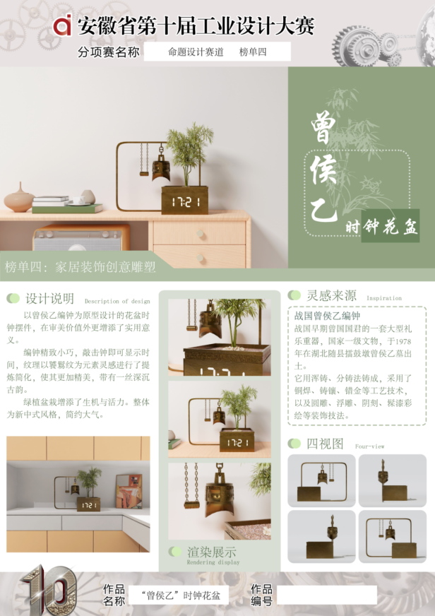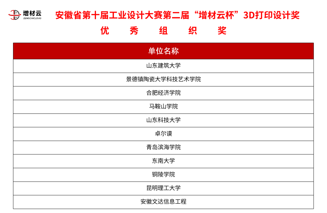 活動的最后大家進(jìn)行了合影留念。安徽經(jīng)濟(jì)報社和增材云視頻號同步進(jìn)行了線上直播,吸引了許多工業(yè)設(shè)計師、相關(guān)行業(yè)從業(yè)人員、3D打印愛好者進(jìn)入直播間,在線上“圍觀”了本次賽事。瀏覽量超10萬人次。本次安徽省第十屆工業(yè)設(shè)計大賽第二屆“增材云杯”3D打印設(shè)計獎分項賽,獲獎作品共計68件,優(yōu)秀指導(dǎo)老師10名,優(yōu)秀組織獎11名。其中《“曾侯乙”時鐘花盆擺件》,曼界設(shè)計的《花舞》等4件作品獲得了一等獎,《spooort運動水壺》、《東壺茶具》、《山水樓臺明月燈》等15件作品獲二等獎,《旭日東升》、《提醒泡泡貼》等49件作品獲三等獎。具體獲獎名單見下方表格。