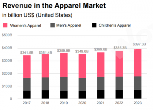 據(jù)statista調(diào)查數(shù)據(jù)顯示,全球服裝市場的收入預(yù)計(jì)將在2023年至2027年間持續(xù)增長2000億美元,增速高達(dá)11.49%。預(yù)計(jì)到2027年,收入達(dá)到1.94萬億美元,總體呈現(xiàn)良好的發(fā)展勢頭。僅美國服裝市場收入就高達(dá)3120億美元,位居世界第 一。