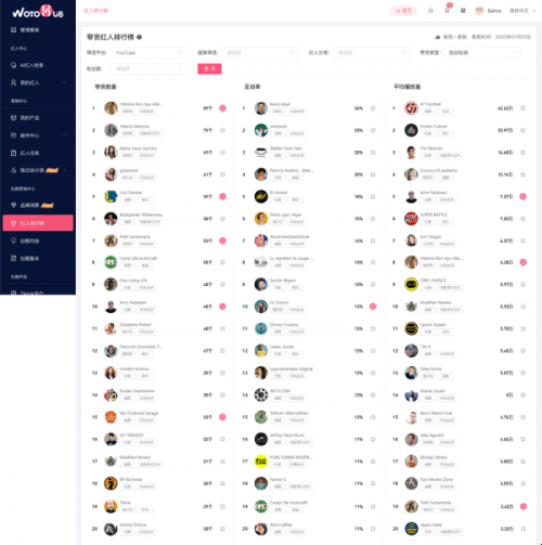 另外,報(bào)告還公開了WotoHub海外網(wǎng)紅智能營銷云基于千萬海外紅人資源,對粉絲粘性高的中長尾部紅人分別進(jìn)行帶貨數(shù)量、互動率、播放量三個(gè)維度的排名。品牌在WotoHub內(nèi)還可在上方導(dǎo)航欄內(nèi)設(shè)置國家、紅人分類、粉絲數(shù)多個(gè)篩選條件,以獲得更為精確的榜單排名,實(shí)現(xiàn)高效、精準(zhǔn)、低成本地鏈接海量帶貨紅人。