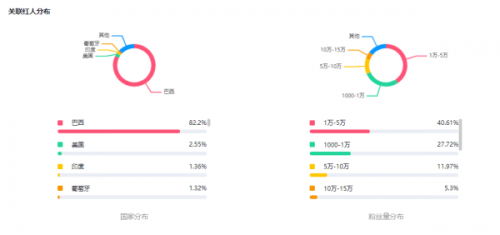 從WotoHub反饋的Veja關(guān)聯(lián)紅人分布情況來看,該品牌的主要目標(biāo)市場為巴西,紅人占比82.2%。在整個(gè)營銷推廣策略中Veja集中選擇中長尾部紅人,合作粉絲量在1到15萬區(qū)間內(nèi)的紅人數(shù)量占比85.6%。