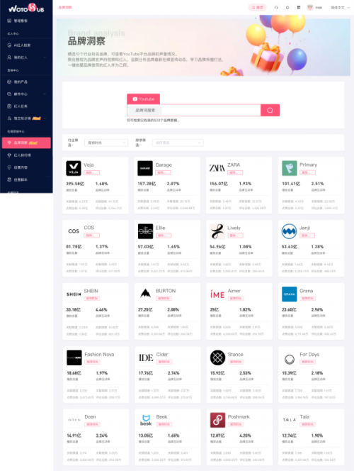 為了幫助品牌更好地解決這個(gè)問題,WotoHub海外紅人智能營銷云基于自身的品牌洞察功能,收集了不同行業(yè)的品牌紅人營銷動態(tài),讓品牌能夠快速洞察到行業(yè)動向,學(xué)習(xí)競品運(yùn)營邏輯。同時(shí)能對競品合作的高互動、高播放量的營銷內(nèi)容進(jìn)行定向開發(fā),挖掘出更多適配的紅人資源。