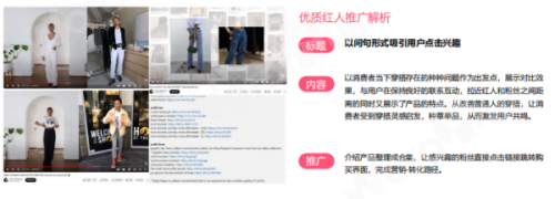 比如紅人好物測評,單品/合集強(qiáng)勢種草的玩法,通過標(biāo)明品牌詞、品類詞或服裝產(chǎn)品賣點(diǎn),視頻內(nèi)容上進(jìn)行服裝產(chǎn)品的全方位測評,精準(zhǔn)滿足消費(fèi)者訴求,影響消費(fèi)者決策。