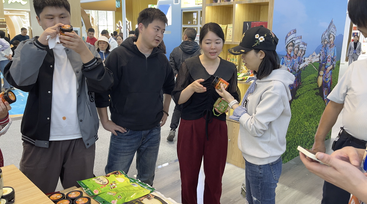 展會(huì)現(xiàn)場(chǎng),除了大家熟悉的恩施玉露、利川紅等知名恩施產(chǎn)品,許多新的恩施符號(hào)也閃亮登場(chǎng)。其中,鶴峰館中的一罐風(fēng)味拌飯醬因其口味獨(dú)特、百搭下飯而深受消費(fèi)者追捧?,F(xiàn)場(chǎng)負(fù)責(zé)人形容【這是一捧來自田間地頭的新鮮“鍋氣”】