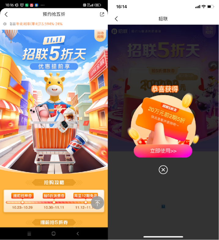 招聯(lián)是你在雙十一購(gòu)物的最佳伙伴,它可以讓你借得方便,花得舒心,賺得開心!快來(lái)參與招聯(lián)五折天活動(dòng)吧,讓你的雙十一不一樣!