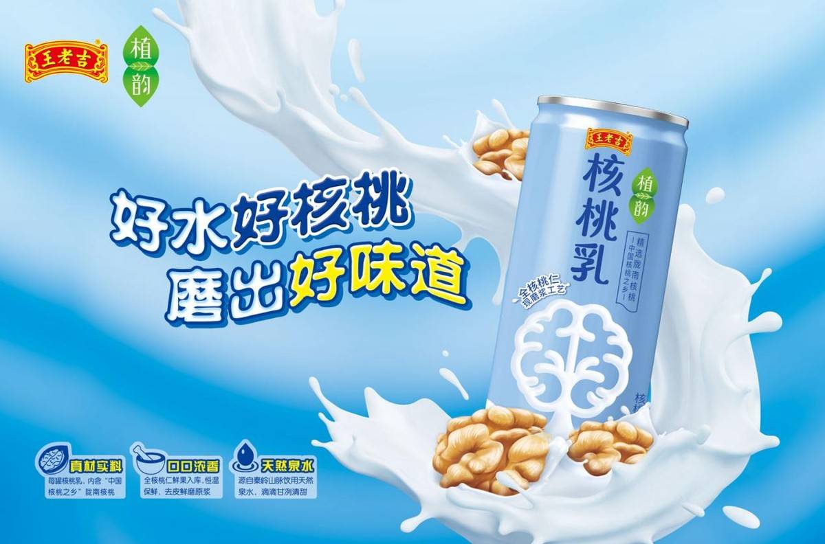 為積極響應(yīng)政 府產(chǎn)業(yè)幫扶號召,助力鄉(xiāng)村振興,王老吉藥業(yè)結(jié)合自身百年老字號的品牌影響力及產(chǎn)業(yè)優(yōu)勢,以好水好核桃為原料,打造新品“王老吉植韻核桃乳植物蛋白飲料”。