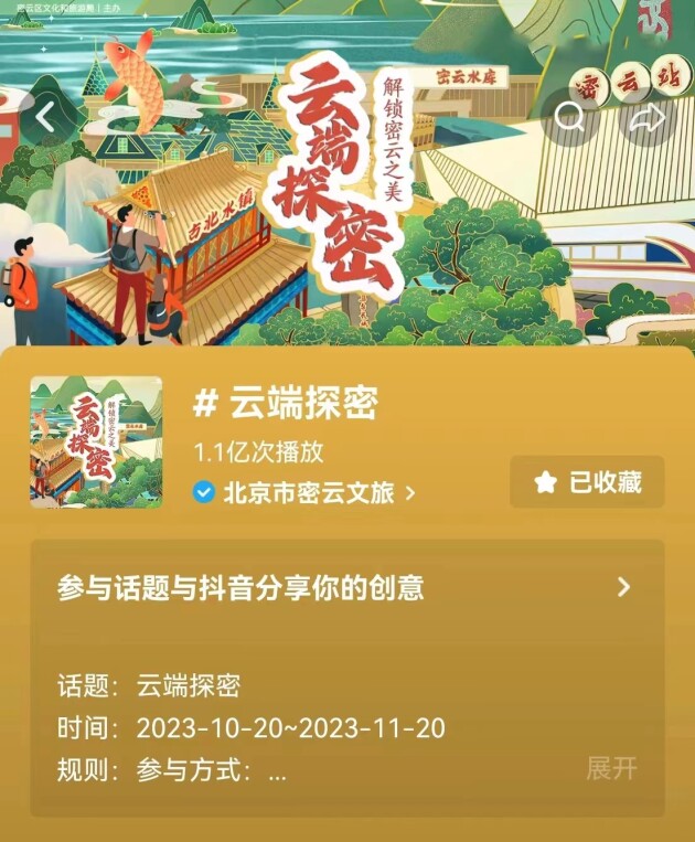 密云文旅開創(chuàng)抖音“云端探密”短視頻挑戰(zhàn)賽至今,投稿視頻總計3942個,參與作者2676位,累計點贊量100W+,累計評論量4W+,累計轉(zhuǎn)發(fā)量10W+,云端探密話題總曝光量突破1.1億次。