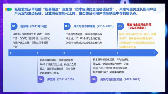 私域發(fā)展已從早期“地址觸達(dá)”走向“技術(shù)驅(qū)動全域共生”。粗放的“無差別群發(fā)”模式面臨瓶頸: