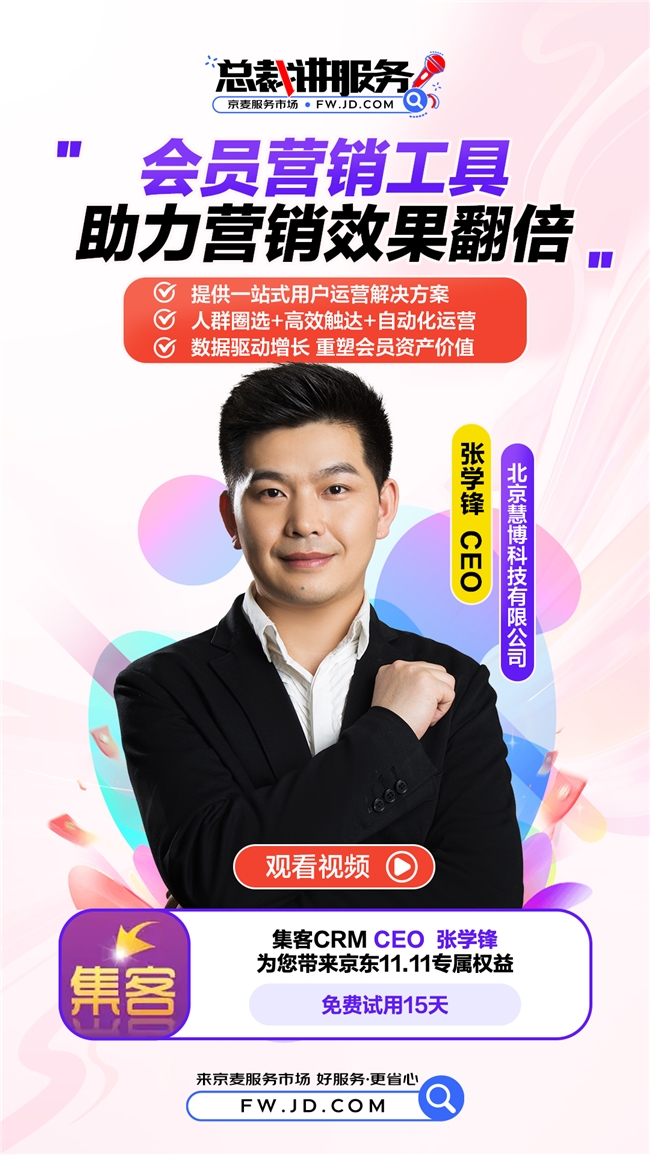 正如慧博科技CEO張學(xué)鋒在京東-京麥商家中心"總裁講服務(wù)"視頻中所說:"集客CRM就是要幫品牌用數(shù)據(jù)驅(qū)動增長,重塑會員資產(chǎn)價值。"關(guān)注【北京慧博科技】公眾號,點(diǎn)擊最新文章,聽張總深度拆解運(yùn)營秘籍,更可直接領(lǐng)取15天免費(fèi)試用名額!