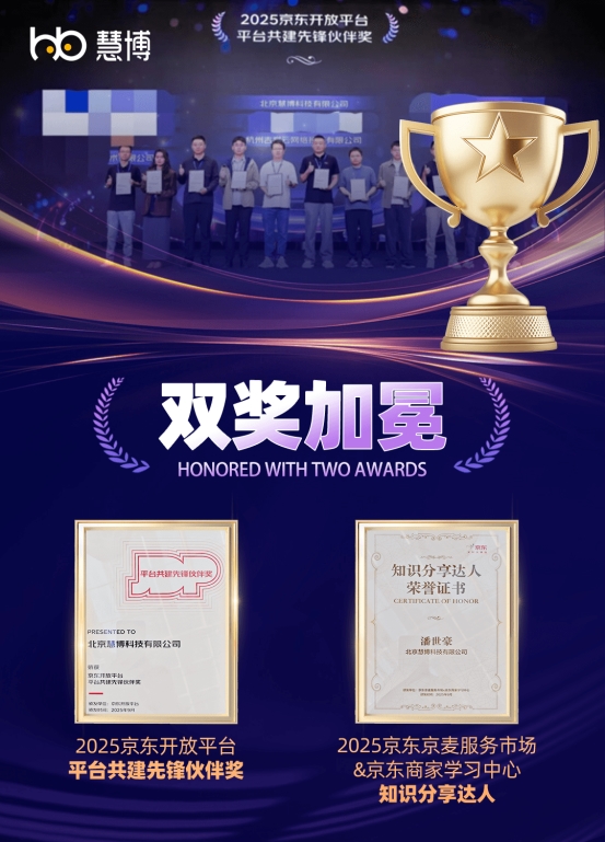 慧博科技自成立以來,便與京東官方保持深度合作,從產(chǎn)品共創(chuàng)到運(yùn)營策略共建,始終緊跟京東生態(tài)發(fā)展步伐,深度融入平臺商家服務(wù)體系。憑借扎實(shí)的技術(shù)與服務(wù)能力,慧博已連續(xù)5年蟬聯(lián)京東"京卓越"優(yōu)秀服務(wù)商獎,在今年10月京東服務(wù)商開放季交流會上,更一舉斬獲"平臺共建先鋒伙伴獎"與"知識分享達(dá)人"雙項(xiàng)大獎——這既是京東對雙方合作的高度認(rèn)可,更印證了集客CRM的硬核實(shí)力。