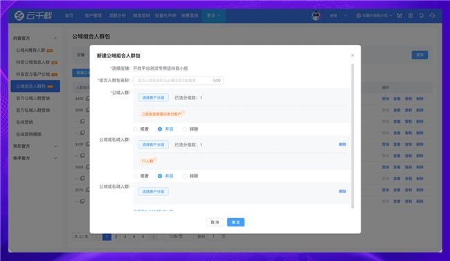 標(biāo)簽自由運(yùn)算”:支持抖音公域人群(官方推薦人群、競(jìng)品人群)與私域人群(品牌客戶(hù)分組)的 “疊加、篩選、排除” 組合運(yùn)算,實(shí)現(xiàn)標(biāo)簽數(shù)據(jù)互補(bǔ);