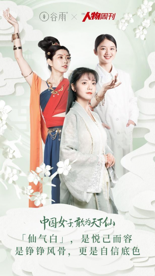 谷雨從傳統(tǒng)東方美人的形象中,提煉出了中國式“仙氣白”的審美追求。即我們所追求的中國式古典美,是溫婉大氣、古典優(yōu)雅、端莊謙和的,而“仙”之一字如今的內(nèi)涵得以延展,更多體現(xiàn)于品格之上,或形容俠肝義膽,或看似出塵于世卻有著自身的理想與堅持。谷雨將這些美好的品格與現(xiàn)代女性獨立自主的品德相融合,與《南方人物周刊》共同合作提出了“敢為天下仙”的現(xiàn)代中國女性形象追求,將“仙氣白”的新古典審美具象化,賦予了中國美人以貫古通今的全新內(nèi)涵。