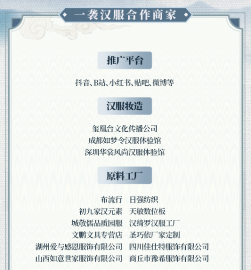 此外,一襲漢服課堂還和來兮如云、泮林PANLIN、仲瀾卿漢定制工坊、成都清歡記服裝設(shè)計(jì)有限公司、華坊記等數(shù)十家漢服商家達(dá)成合作。這些都是目前漢服市場上備受好評(píng)的漢服商家,對(duì)于設(shè)計(jì)稿的需求量也比較大。學(xué)員們可以直接把漢服設(shè)計(jì)稿對(duì)接給漢服商家審核。