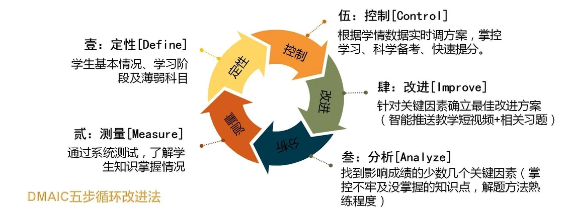 據(jù)創(chuàng)而新(廣東)數(shù)媒運(yùn)營(yíng)總裁孫自偉介紹,海棠樹(shù)學(xué)情導(dǎo)航應(yīng)用的基本模型參考了著名的6σ質(zhì)量理論的五步循環(huán)改進(jìn)法( DMAIC ),通過(guò)五個(gè)步驟持續(xù)改進(jìn)學(xué)生學(xué)習(xí)方法,提高學(xué)生學(xué)習(xí)效率。