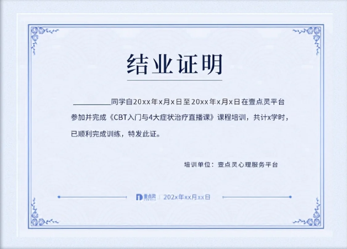 本次獨(dú)家課程只開1期,前100名可享受報(bào)名優(yōu)惠。成功參與4次直播課程且完課率>60%,即可申請(qǐng)壹點(diǎn)靈心理服務(wù)平臺(tái)頒發(fā)的電子版學(xué)習(xí)結(jié)業(yè)證書。