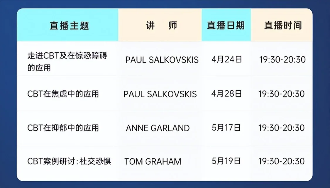 直播課分為4場(chǎng),直播時(shí)間4.24-5.19,將精準(zhǔn)解決CBT在「驚恐障礙」「焦慮」「抑郁」以及「社交恐懼」中的應(yīng)用。