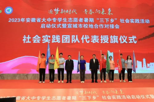 活動現(xiàn)場,宣城市委書 記李中,團省委書 記陳明生,省文明辦副主任王芳,省教育廳思政處處長王后林,宣城市委常委、組織部長朱立軍,宣城市政府副市長汪侃,省委宣傳部宣傳教育處三級調研員朱珠等共同啟動2023年安徽省大中專學生志愿者暑期“三下鄉(xiāng)”社會實踐活動,并向暑期“三下鄉(xiāng)”社會實踐團隊代表授旗。