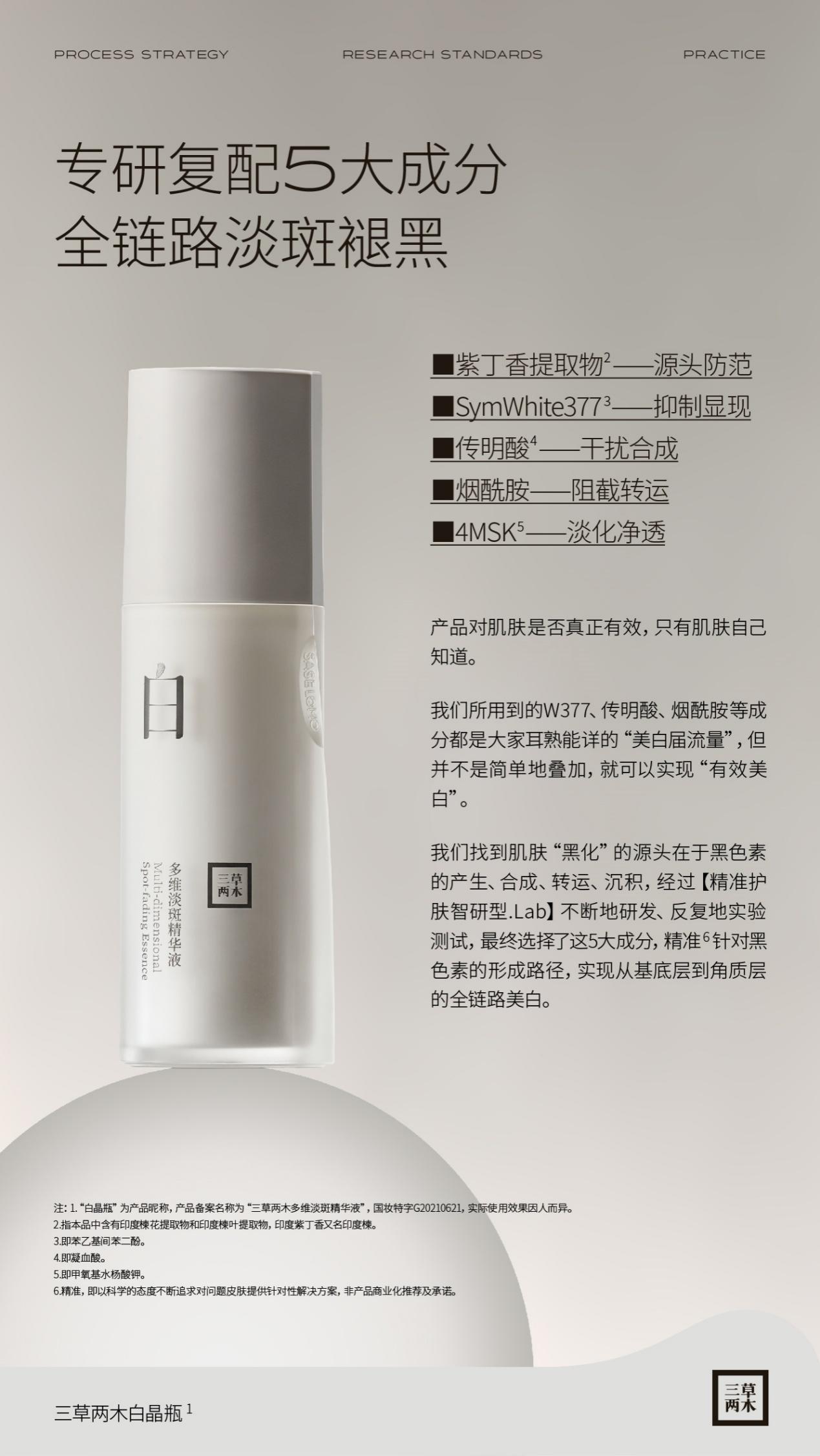 在經(jīng)過三草兩木“精準(zhǔn)護(hù)膚智研型.Lab”不斷研發(fā)、反復(fù)實(shí)驗(yàn)、測試改進(jìn)后,最終選擇了紫丁香提取物、SymWhite377、傳明酸、煙酰胺、4MSK為五大核心成分,從源頭防范、抑制顯現(xiàn)、干擾合成、阻截轉(zhuǎn)運(yùn)、淡化凈透入手來實(shí)現(xiàn)全鏈路淡斑褪黑,達(dá)到精準(zhǔn)及真正有效的美白效果。并且團(tuán)隊(duì)深知:W377、傳明酸、煙酰胺等成分可謂是大家耳熟能詳?shù)摹懊腊讓昧髁俊?,但這些成分并不是簡單疊加起來就能實(shí)現(xiàn)“有效美白”,成分的含量、安全性及純度等,都對(duì)美白效果起著至關(guān)重要的作用。正是經(jīng)過長時(shí)間不斷地調(diào)試,三草兩木白晶瓶才最終誕生,并且在各方面均達(dá)到或超過研發(fā)團(tuán)隊(duì)預(yù)期效果,成為一款真正意義上的“美白利器”。
