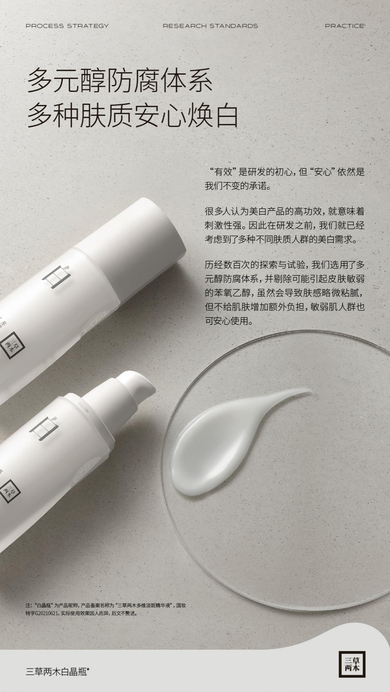 “有效”固然是研發(fā)的初心,但“安心”更是三草兩木不變的承諾。在研發(fā)三草兩木白晶瓶這款產(chǎn)品之前,團(tuán)隊(duì)就已經(jīng)考慮到了多種不同膚質(zhì)人群的美白需求,要求產(chǎn)品必須要溫和、安全、無刺激,適合各類膚質(zhì)。為達(dá)到這個(gè)目的,團(tuán)隊(duì)在經(jīng)歷數(shù)百次探索、試驗(yàn)后,選用多元醇防腐體系成功解決了安全問題,剔除掉可能引起皮膚敏感、脆弱的苯氧乙醇,實(shí)現(xiàn)溫和美白,讓敏感脆弱肌膚人群也可安心使用。