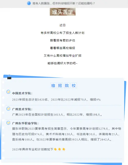 廣州美術(shù)學(xué)院:廣美2023年在全國(guó)擬計(jì)劃招生1613人,相比2022年,縮招198人;