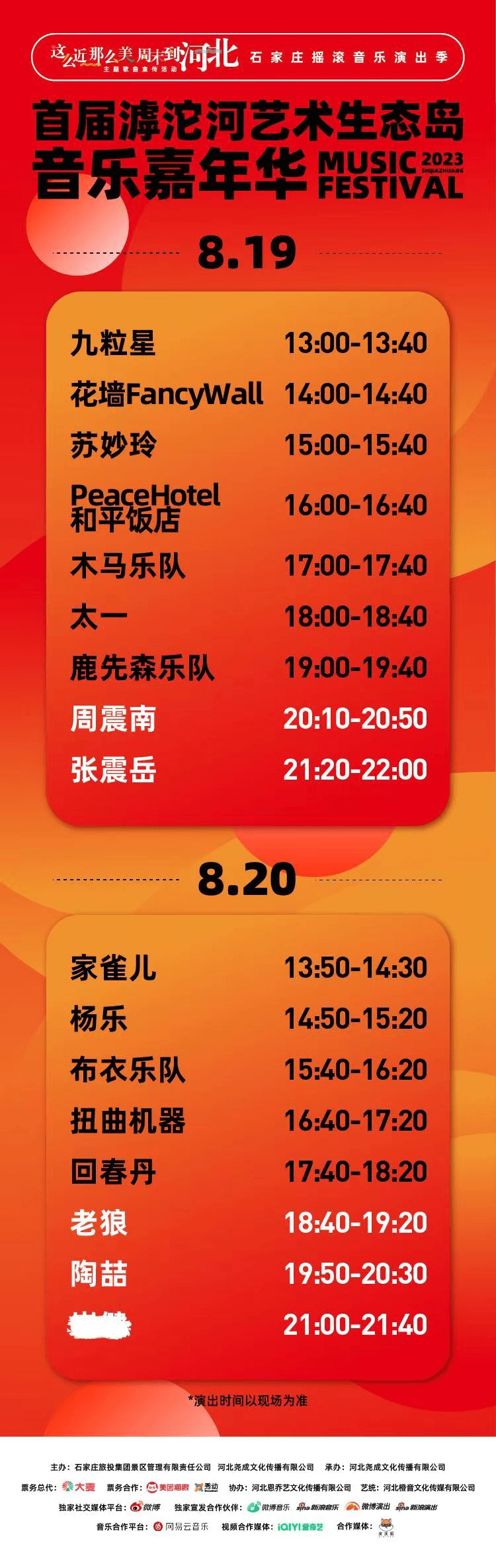 此次音樂嘉年華演出時間為: 8月19日、20日(周末兩天),地點位于石家莊滹沱河藝術(shù)生態(tài)島。8月4號(周五)上午10點,預售正式開啟。8月6日(周日)上午10點,音樂嘉年華正式開票!