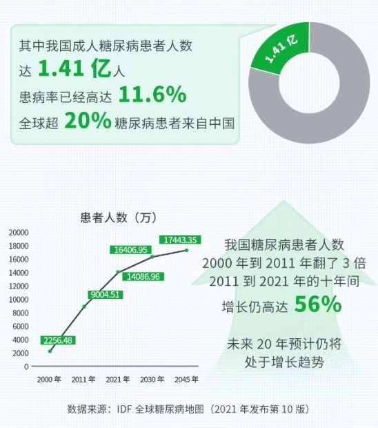 根據(jù)國際糖尿病聯(lián)合會(IDF)發(fā)布的《2021IDF全球糖尿病地圖(第10版)》公布的數(shù)據(jù)顯示,我國糖尿病患者人數(shù)高達1.4億,其中約7283萬患者尚未被確診,比例高達51.7%。