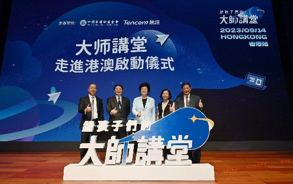 現(xiàn)場圖:中國宋慶齡基金會(huì)主 席李斌、香港中聯(lián)辦副主任尹宗華、香港民政與青年事務(wù)局局長麥美娟、騰訊集團(tuán)高級(jí)副總裁郭凱天、香港洛士文基金創(chuàng)會(huì)會(huì)長胡曉明共同啟動(dòng)“《給孩子們的大師講堂》走進(jìn)香港”。