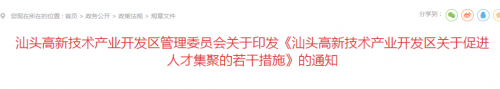 汕頭高新技術(shù)產(chǎn)業(yè)開發(fā)區(qū)為促進(jìn)人才集聚,發(fā)布人才獎勵措施: