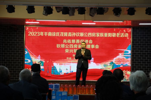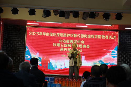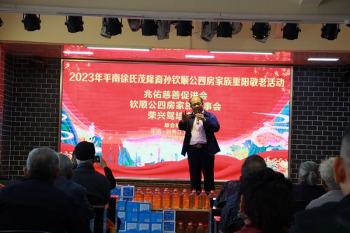 2023年10月21日上午11點(diǎn),平南縣思旺鎮(zhèn)崇秀村到秀江文化園里歡聲笑語熱鬧非凡,2023年平南徐氏茂隆裔孫欽順公(四房)家族重陽敬老活動在這里隆重舉行,參加活動的人員有兆佑慈善促進(jìn)會班子成員、榮興企業(yè)部份單位領(lǐng) 導(dǎo)、熱心企業(yè)家、愛心人士及受慰問的老人等共有二百多人參加。敬老節(jié)目主持人由徐家豪擔(dān)任,本次重陽敬老活動由兆佑慈善促進(jìn)會牽頭,聯(lián)合榮興駕培企業(yè)、欽順公四房家族理事會共同舉辦,并得到了熱心人士捐款大力支持敬老活動,其目的是傳承和發(fā)揚(yáng)好中華民族傳統(tǒng)美德,為家鄉(xiāng)人民樹立起敬老愛老助老的時(shí)代道德新風(fēng)尚,為促進(jìn)社會文明、民族團(tuán)結(jié)進(jìn)步高質(zhì)量發(fā)展而共同努力。