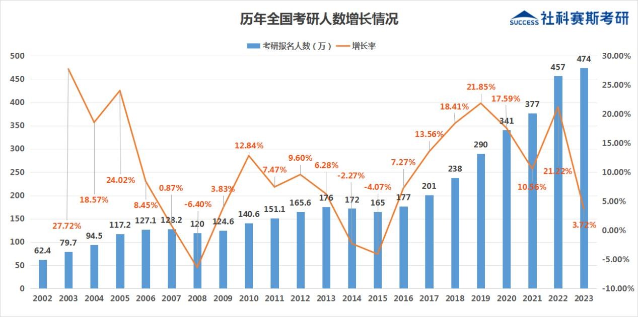 考研人數(shù)在近些年保持了飛速增長(zhǎng)的趨勢(shì),2023年出現(xiàn)放緩的趨勢(shì),但人數(shù)也是達(dá)到了史無(wú)前例的474萬(wàn)人。據(jù)社科賽斯考研CEO李發(fā)進(jìn)預(yù)測(cè):“2024級(jí)考研報(bào)名人數(shù)應(yīng)該很難再出現(xiàn)前幾年那么大幅度的增長(zhǎng),雖然增長(zhǎng)幅度會(huì)放緩,但是人數(shù)還是會(huì)增加的。”