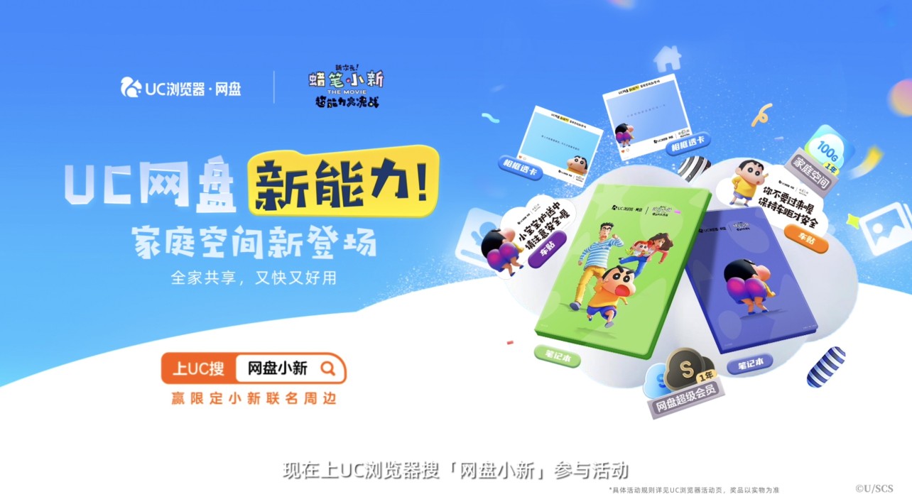 此次UC網(wǎng)盤上新之際,正值電影《蠟筆小新:新次元!超能力大決戰(zhàn)》上映。UC網(wǎng)盤聯(lián)合《蠟筆小新》推出蠟筆小新聯(lián)名家庭空間,不僅有蠟筆小新界面換膚主題,還有限定小新聯(lián)名家庭手帳、寶寶車貼、拍立得式透卡相框三款周邊等好禮。