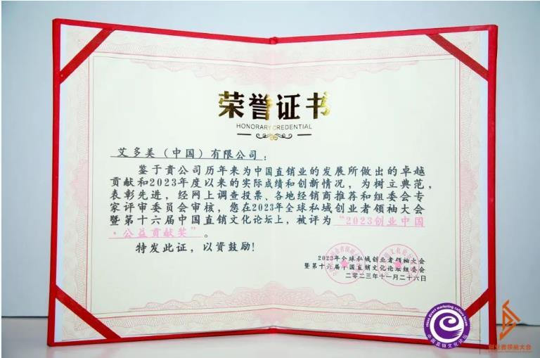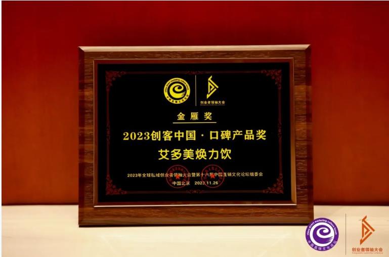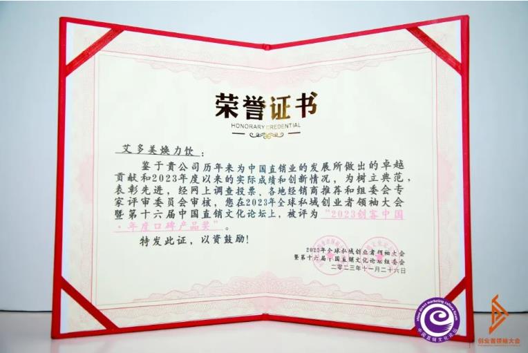 近日,“2023年全球私域創(chuàng)業(yè)者領(lǐng) 袖大會(huì)”在北京隆重舉行。艾多美(中國)有限公司受邀參加會(huì)議,并榮獲年度公益貢獻(xiàn)獎(jiǎng),艾多美煥力飲榮獲年度口碑產(chǎn)品獎(jiǎng)。