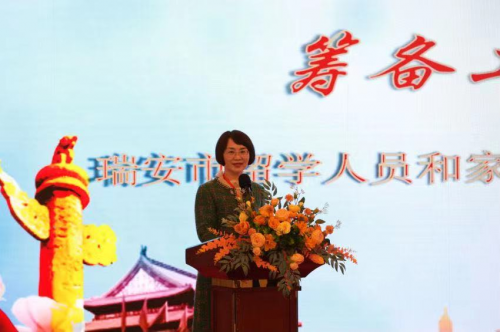 新當選的瑞安市留學人員和家屬聯(lián)誼會北京分會第 一屆理事會洪曉瑩會長代表理事會發(fā)言。