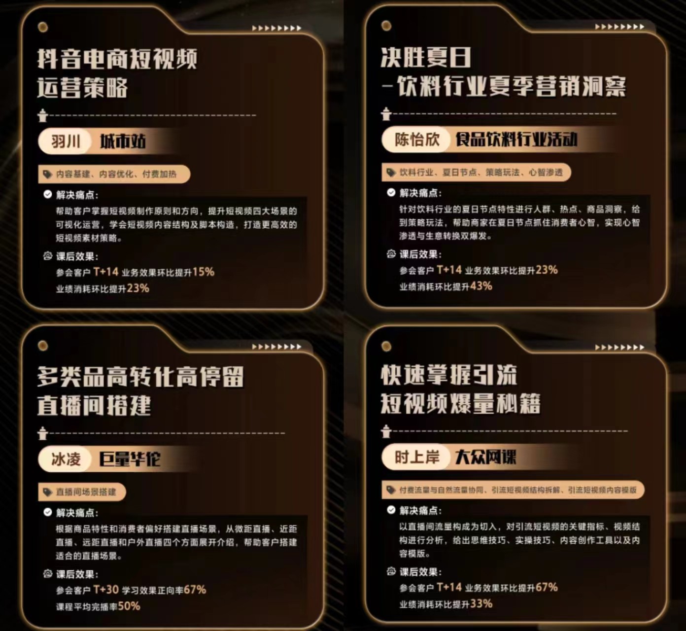 為了給商家持續(xù)提供前沿適配的營銷方法、解決實際生意卡點,巨量引擎大眾消費業(yè)務中心聯(lián)動巨量學及內(nèi)外部一線講師,設計搭建了維度多樣的商家培育課程體系,從理論到實操,從新手到進階,提供了海量學習資源,助力商家們的生意增長與能力提升。