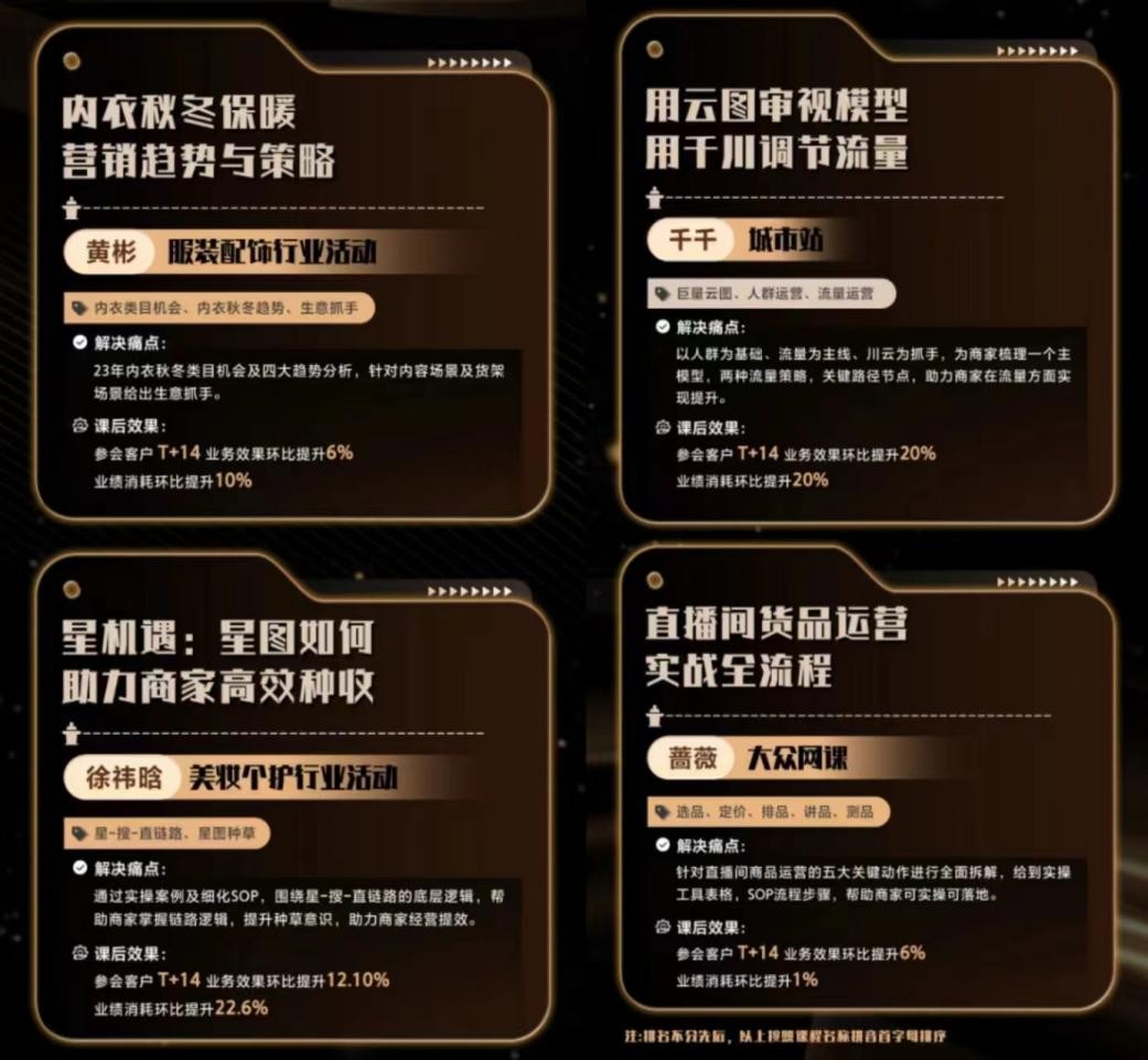 在榜單中,有針對美妝個護、服裝配飾、日化母嬰、食品飲料、3C電器等大眾消費五大行業(yè)的垂直課程,也有來自大眾網(wǎng)課、城市站、巨量華佗等全行業(yè)項目的通識課程,其內(nèi)容涵蓋了直播、短視頻、人群運營、貨品運營等經(jīng)營策略,以及巨量千川、巨量云圖、巨量星圖等產(chǎn)品進階攻略。