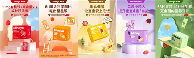作為國(guó)內(nèi)功能性食品領(lǐng) 先品牌,Minayo美那有自成立以來結(jié)合市場(chǎng)消費(fèi)者的需求痛點(diǎn),以科學(xué)循證為產(chǎn)品研發(fā)、生產(chǎn)策略,持續(xù)打造出富鐵家族、緋紅瓶等爆款產(chǎn)品,并以此迅速切入護(hù)肝護(hù)眼、美容養(yǎng)顏、功能免疫、腸胃道健康、骨骼健康等領(lǐng)域,推出功能軟糖系列、跨境膳食營(yíng)養(yǎng)系列、藍(lán)帽子系列等產(chǎn)品,為國(guó)人的健康提供豐富的選擇。Minayo美那有兒童營(yíng)養(yǎng)棒的全新推出,進(jìn)一步擴(kuò)展了品牌的產(chǎn)品矩陣。而憑借Minayo美那有的產(chǎn)品實(shí)力及此前積累的市場(chǎng)口碑,兒童營(yíng)養(yǎng)棒有望成為Minayo美那有的下一個(gè)爆款產(chǎn)品系列。