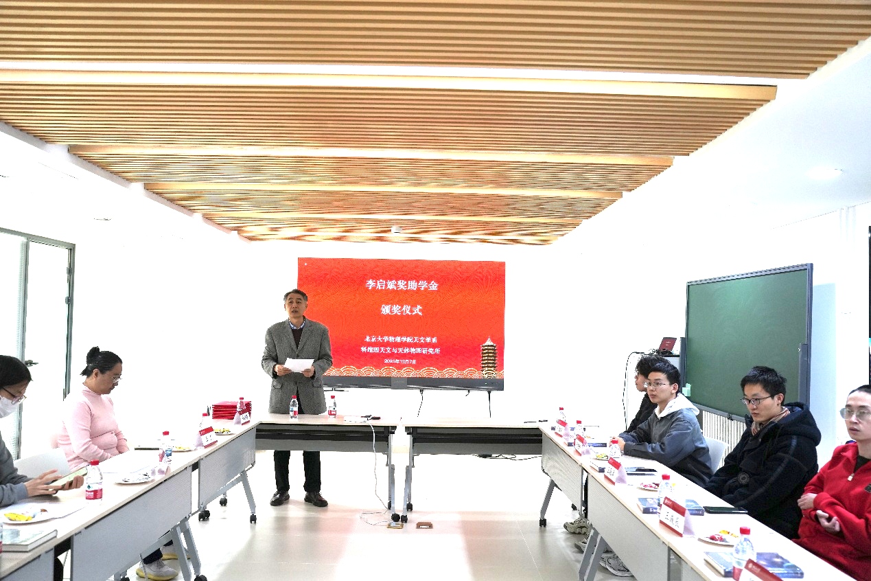 儀式由北京大學(xué)物理學(xué)院天文學(xué)系主任張華偉教授主持,天文學(xué)系吳學(xué)兵教授首先介紹獎(jiǎng)助學(xué)金設(shè)立背景:為紀(jì)念著名天文學(xué)家、原中國科學(xué)院北京天文臺(tái)(現(xiàn)國家天文臺(tái))臺(tái)長(zhǎng)李啟斌先生,培育天文領(lǐng)域后備人才,該獎(jiǎng)助學(xué)金面向北大天文學(xué)科優(yōu)秀本研學(xué)生設(shè)立。2025年11月經(jīng)學(xué)生申請(qǐng)、系評(píng)審委員會(huì)五位老師投票,最終八位同學(xué)入選。吳學(xué)兵教授鼓勵(lì)同學(xué)們傳承老一輩天文學(xué)家的奉獻(xiàn)精神,扎實(shí)治學(xué),為我國天文事業(yè)添磚加瓦。