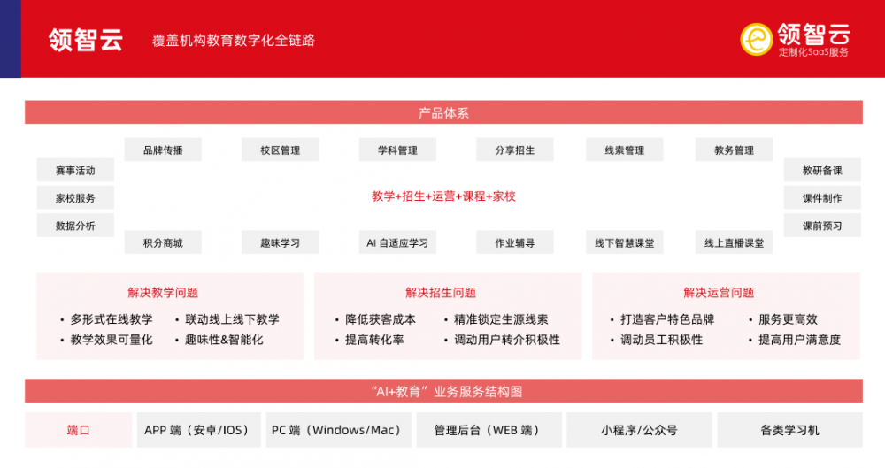 在此背景下,領智云的獲獎案例尤為凸顯出務實的風格,根植于超10萬家機構的服務經(jīng)驗,解決方案始終聚焦“教、學、練、評、管”的全流程提效與體驗升級。