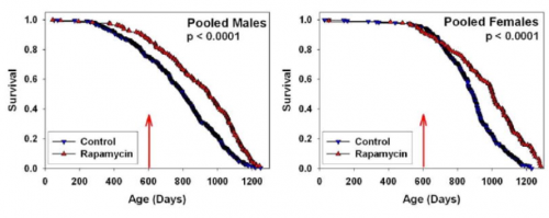 2009年《自然》期刊發(fā)表的文章顯示,從小鼠9個月大(相當于人類30-35歲)時喂食雷帕霉素,可使雌性小鼠壽命延長14%,雄性小鼠壽命延長9%。這是首個證實服用雷帕霉素可延長實驗動物壽命的研究。而后續(xù)的研究證實,雷帕霉素還可改善實驗動物的認知下降、心血管功能障礙等。